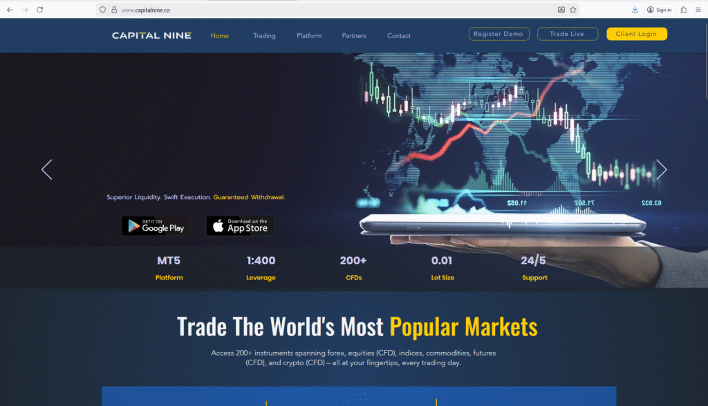 CapitalNine (capitalnine.co) markets itself as a broker offering forex, CFD, crypto, stocks, and commodity trading under the banner of “superior liquidity,” “swift execution,” and “guaranteed withdrawals.” On its face, it promises a one-stop solution: a single account, high leverage up to 1:400, zero commission, segmented bank accounts, and global reach. But beneath that glowing presentation lie multiple red flags and serious questions. Below are seven ruthless truths that uncover how CapitalNine operates more like a predatory broker than a trustworthy platform.