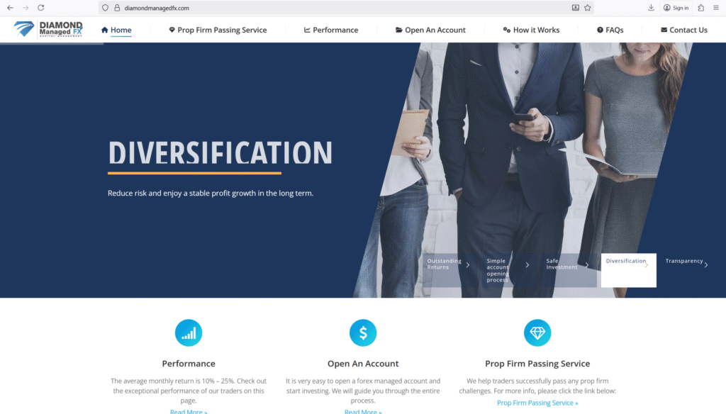 DiamondManagedFX advertises services like “Prop Firm Passing” and “Managed Forex Accounts,” promising to pass challenges and then manage funds for high returns. But such “guaranteed” services are notoriously abused. In one BBB Scam Tracker report, a user said they paid $1,200, gave account credentials, were told the challenge was passed, then the managers blew the account. When real money enters third-party hands, control and transparency vanish.